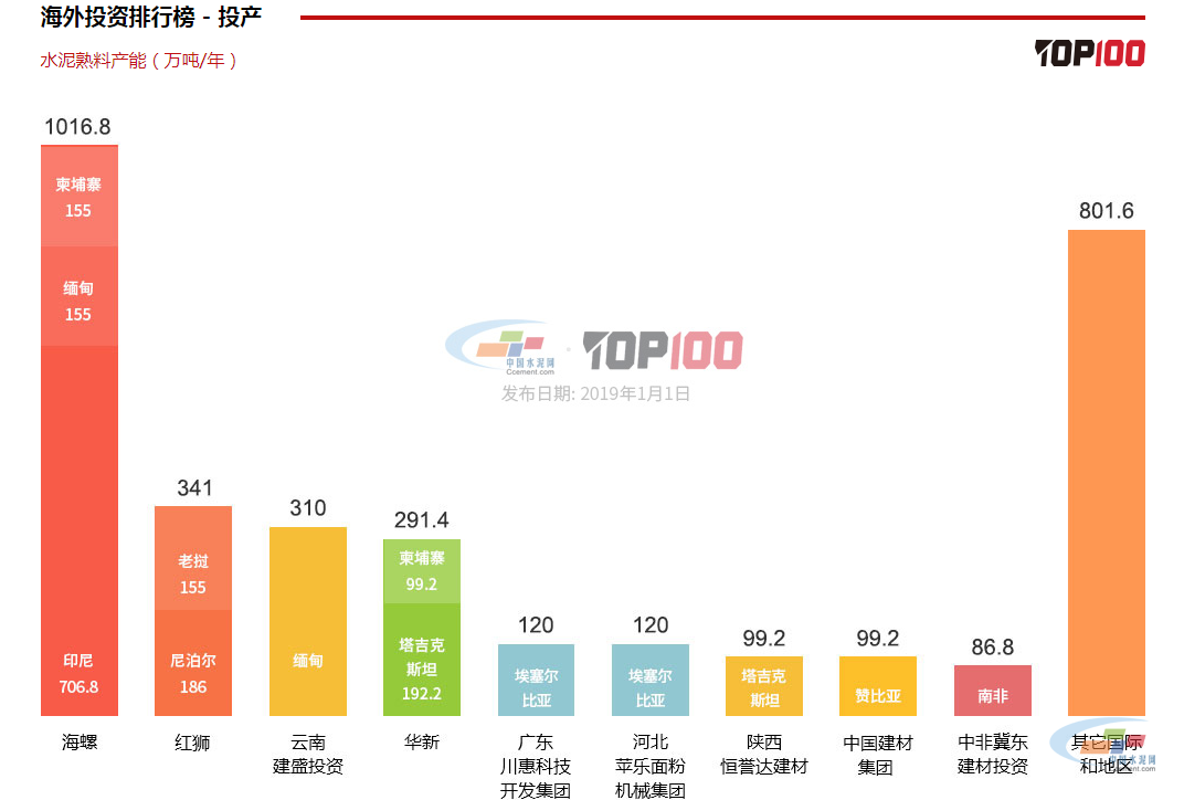 海螺集團2018年海外投資水泥熟料產能1016萬噸,相較2017年成倍增長。去年海外投資未上榜的紅獅集團2018年以341萬噸躍居第二位。