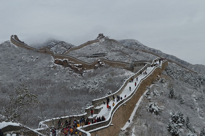 第二天的七點(diǎn),我們就到達(dá)了天下第一雄關(guān)居庸關(guān),開始攀登八達(dá)嶺長(zhǎng)城。八達(dá)嶺長(zhǎng)城,位于北京市延慶縣軍都山關(guān)溝古道北口,是明長(zhǎng)城的一個(gè)隘口,為居庸關(guān)的重要前哨,古稱“居庸之險(xiǎn)不在關(guān)而在八達(dá)嶺”。萬里長(zhǎng)城,雄偉險(xiǎn)峻,雪中的長(zhǎng)城更是如此。山巒重疊,形勢(shì)險(xiǎn)要,氣勢(shì)極其磅礴的城墻南北盤旋延伸于雪山峻嶺之中,視野所及,不見盡頭。